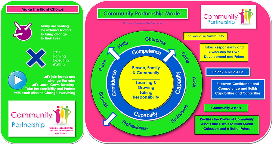 Community Partnership is an opportunity for anyone who wishes to play a meaningful role in contributing to change in local communities. All that is needed is a willingness to give time and contribute to planning and implementing change with individuals, families and communities. This is done in a way that respects and gives people power to take responsibility and ownership as they rebuild their confidence, competence, capacity and capabilities to change their life chances and broaden opportunities to achieve their hopes and dreams.